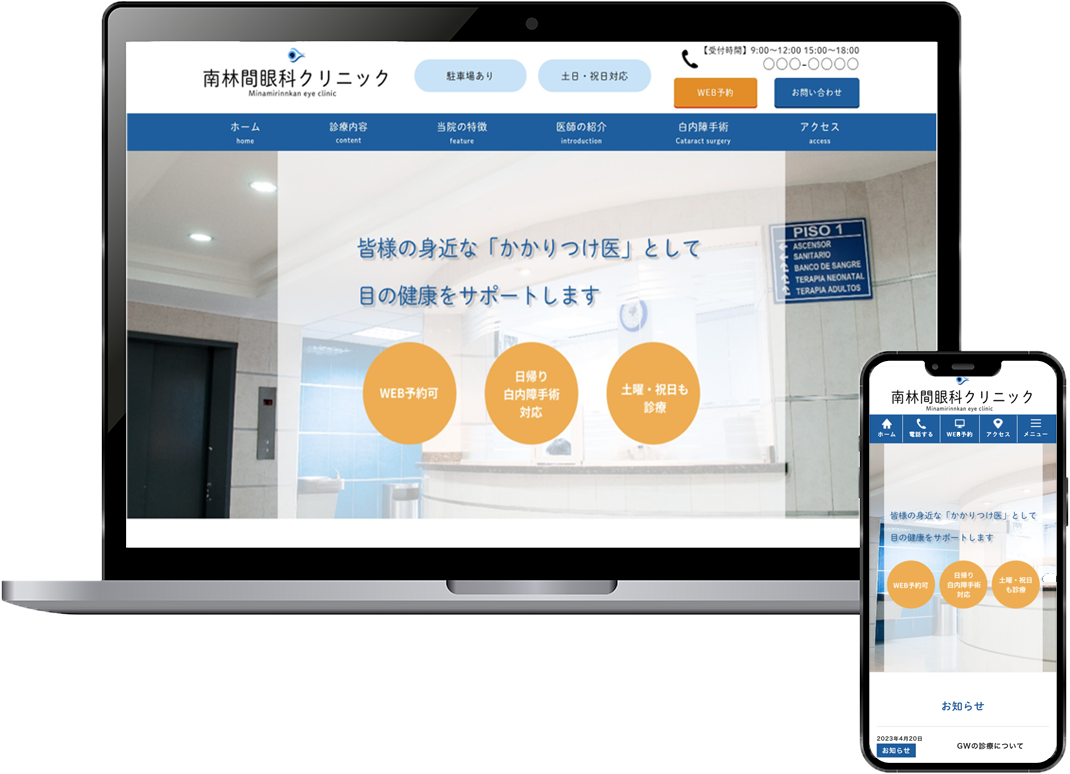 目の不調で新規で診療を考えている方にクリニックでの診療内容や診療方針、診療までの流れなど診療に対して分からない事や不安を払拭して安心して来院してもらえるような構成にしました。